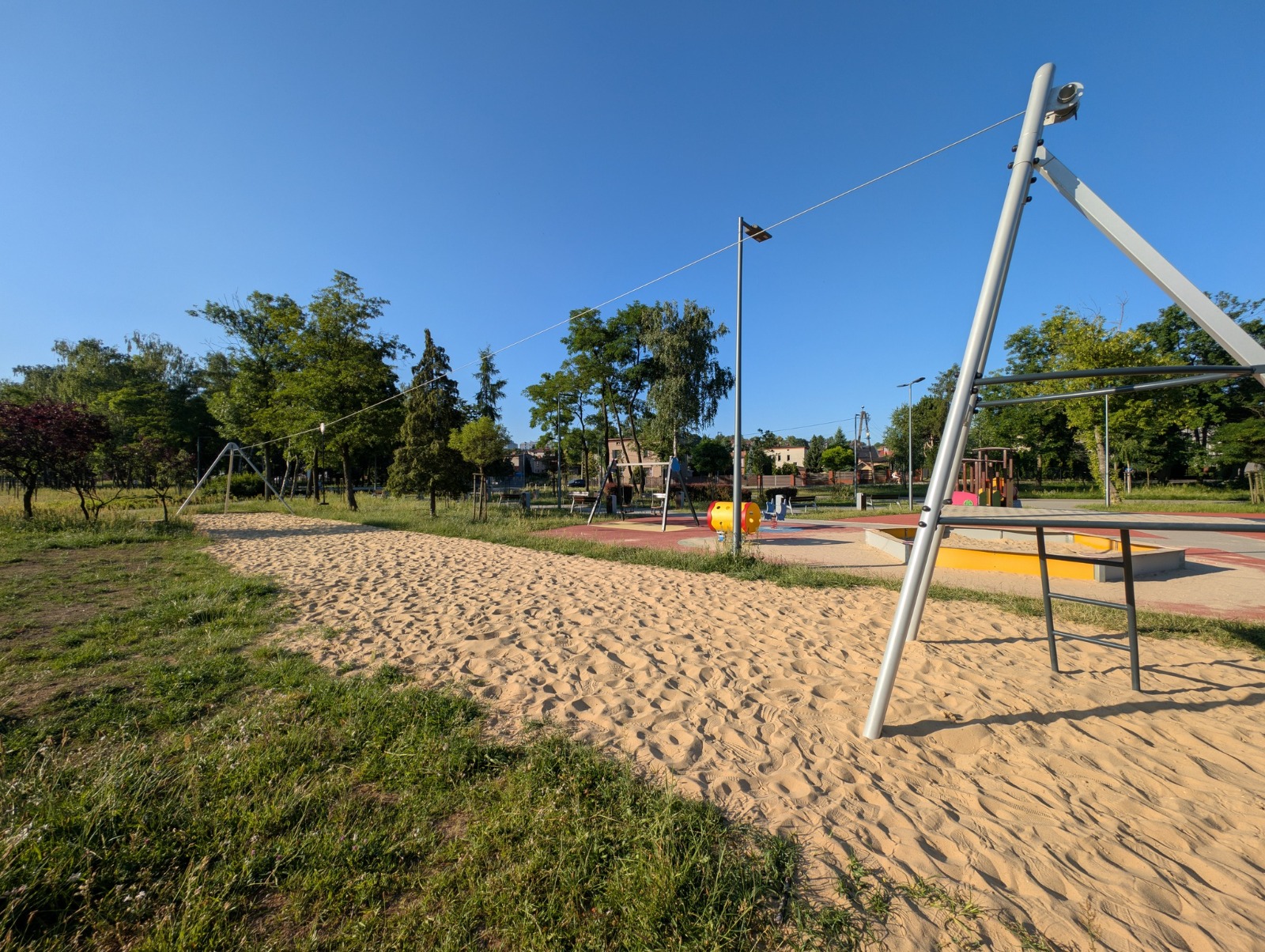 Plac zabaw wyposażono między innymi w zjeżdżalnie, zjazd strażacki, ścianki wspinaczkowe, linarium oraz inne atrakcje, które z pewnością przypadną do gustu najmłodszych.