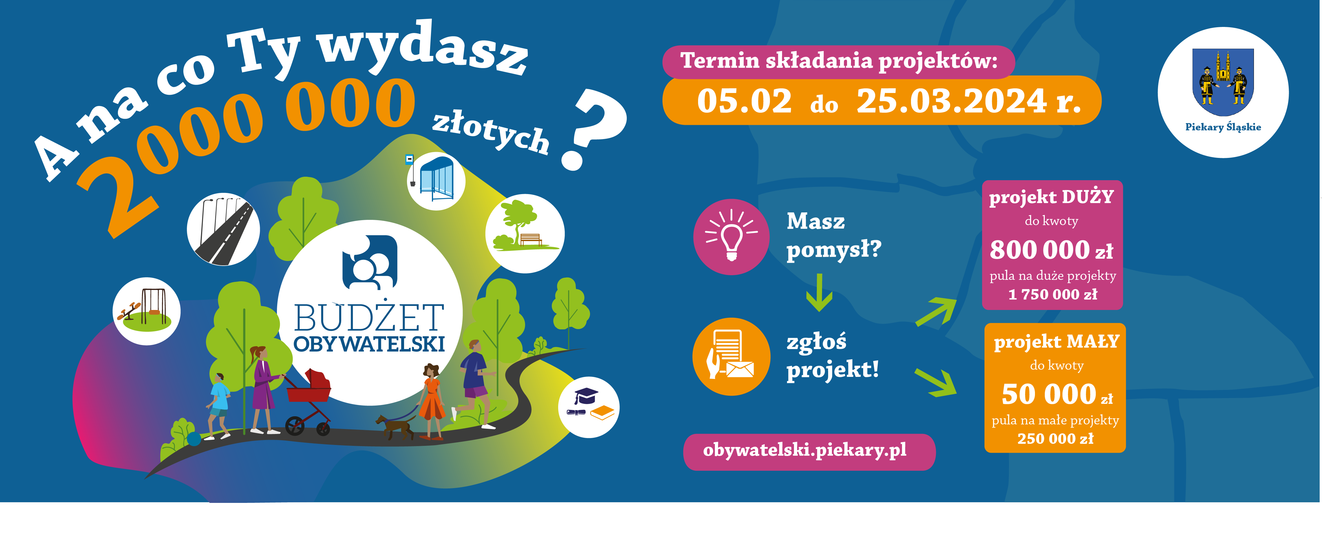 5 lutego 2024 r. wystartuje 11. edycja piekarskiego Budżetu Obywatelskiego. Wnioski z pomysłami można składać do 25 marca. Łącznie do dyspozycji będziecie mieli 2.000.000 zł. Podobnie jak w ubiegłym roku obowiązywać będzie podział na duże i małe projekty. Głosowanie ruszy pod koniec maja 2023 r. Nie możemy się doczekać Waszych pomysłów na zmianę Piekar!